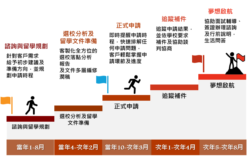 我們提供全年齡向的專業留學諮詢,在您忙著學業、畢業或者工作之際,我們能夠為您節省大量時間,在您專注於手邊事務的同時,能夠進一步地得到高品質的申請文件,更有機會去申請到理想的學校。